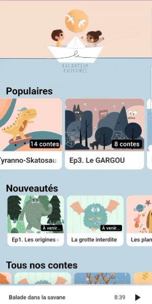 Le Raconteur d’histoires, c’est une application que j’ai créée, qui regroupe une centaine de contes pour enfants de 3 à 8 ans. Vous pourrez y trouver des contes de dinosaures, des contes relaxants, des contes de superhéros, ou même des contes de Noël.